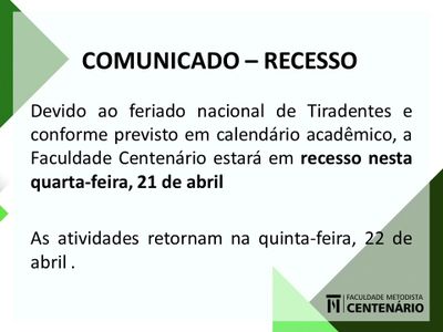Devido ao feriado nacional de Tiradentes e conforme previsto em calendário acadêmico, a Faculdade Centenário estará em recesso nesta quarta-feira, 21 de abril