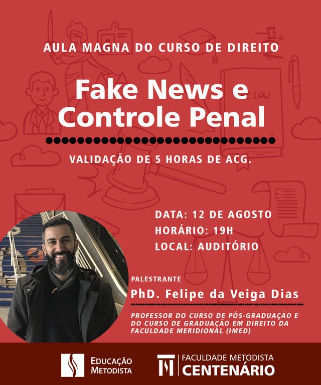 Aula Magna do curso de Direito será em 12 de agosto e irá tratar sobre Fake News e Controle Penal