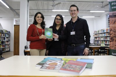 A professora Fabiana entregou os exemplares ao coordenador da pós-graduação em Agronegócios, Ezequiel Redin e à bibliotecária Bárbara Milbrath.