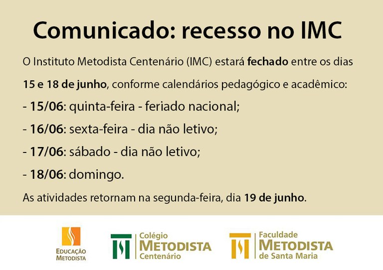 O Instituto Metodista Centenário (IMC) estará fechado entre os dias 15 e 18 de junho, conforme os calendários pedagógico e acadêmico: