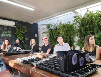 Eles foram recebidos pela egressa do curso de Design de Interiores do IPA, Miriam Haas, representante da empresa. A Ecotelhado oferece soluções biofílicas completas, de arquitetura sustentável e infraestrutura verde do Brasil.