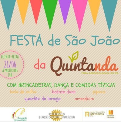 Nesta quinta feira, 21 de junho, o Projeto de Extensão Quintanda – Feira Agroecológica do IPA promoverá uma comemoração alusiva aos festejos juninos.