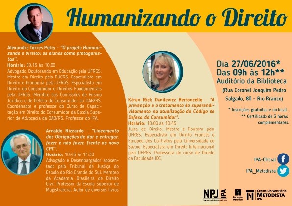 O Curso de Direito esta promovendo o evento “Humanizando o Direito”, que também é o nome do projeto que consiste no site: http://www.humanizandoodireito.com.br/ que será atualizado constantemente até o dia do evento. No site, serão colocados materiais produzidos pelos estudantes de Direito do IPA ao longo do semestre.