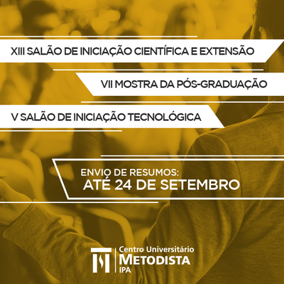 Entre os dias 22 e 26 de outubro de 2018, o Centro Universitário Metodista - IPA promoverá o XIII Salão de Iniciação Científica e Extensão, a VII Mostra da Pós-Graduação e o V Salão de Iniciação Tecnológica.