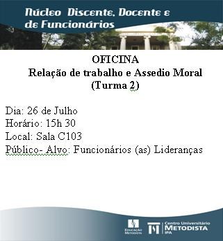Nos dias 25 e 26 de julho serão ofertadas pelo Núcleo Discente, Docente e de Funcionários duas oficinas com a temática relações interpessoais no trabalho e o assédio moral. As oficinas serão ministradas pela psicóloga Raquel da Rosa e terão como público-alvo lideranças de setores e encarregados de setores. Nessas duas primeiras turmas participarão os setores que realizam o atendimento ao público e tem por objetivo promover um espaço de formação, comunicação e multiplicação de boas práticas que promovam e assegurem a dignidade humana, cidadania e o incentivo ao combate a práticas de preconceito, discriminação e assédio.