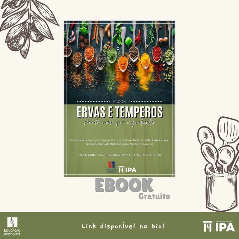 O curso de Nutrição do Centro Universitário Metodista IPA lançou em outubro o ebook Ervas e Temperos. O material foi idealizado na disciplina de Nutrição e Dietética pelas alunas Natália Laitano, Natália Dichuta, Mariane Coccaro e Vívian Giovanaz, do 2o semestre, junto com as professoras Ana Henz e Katia Petry.