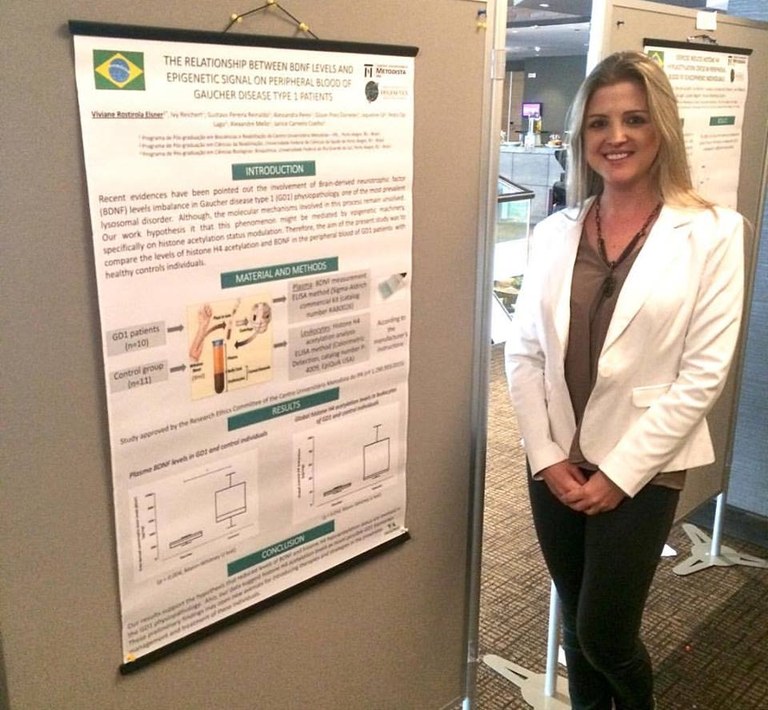 O segundo trabalho foi apresentado pela Profª Viviane Rostirola Elsner e é intitulado “The relationship between BDNF levels and epigenetic signal on peripheral blood of Gaucher disease type 1 patients”. Este trabalho recebeu o prêmio/destaque de melhor pôster do evento. O estudo foi realizado em parceria com os professores do PPG em Biociências e Reabilitação Dr. Alexandre Mello e Alessandra Peres e contou com a colaboração dos egressos do PPG, hoje mestres, Ivy Reichert Vital da Silva e Gilson Dorneles, do egresso do curso de Fisioterapia-IPA Gustavo Reinaldo, além de pesquisadores/professores da UFRGS e UFCSPA.